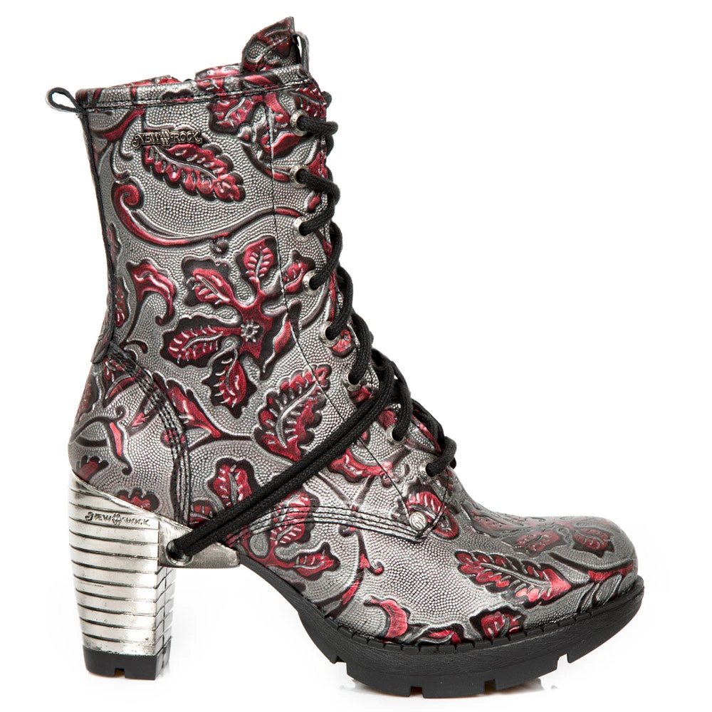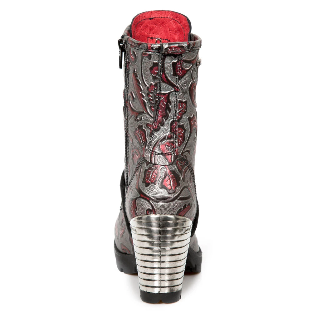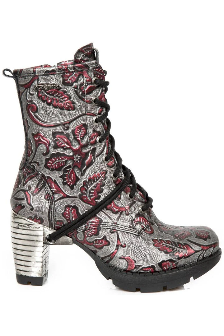 New Rock Red Metallic Vintage Flower Ankle Boots M.TR001-S6. Leather. Embossed flower pattern, with lacing and steel heel. Side zip. Part of the Trail Collection.