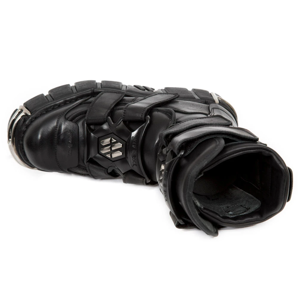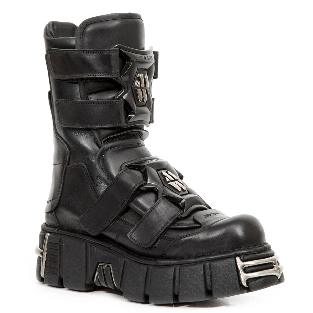 New Rock M,422 Velcro Tower Boots M.422-S1. Leather Boot is fastened by 4 velcro straps and decorated on the front by 2 plates with the rock logo. Tower Platform Sole. Part of the Metallic Collection. Unisex.