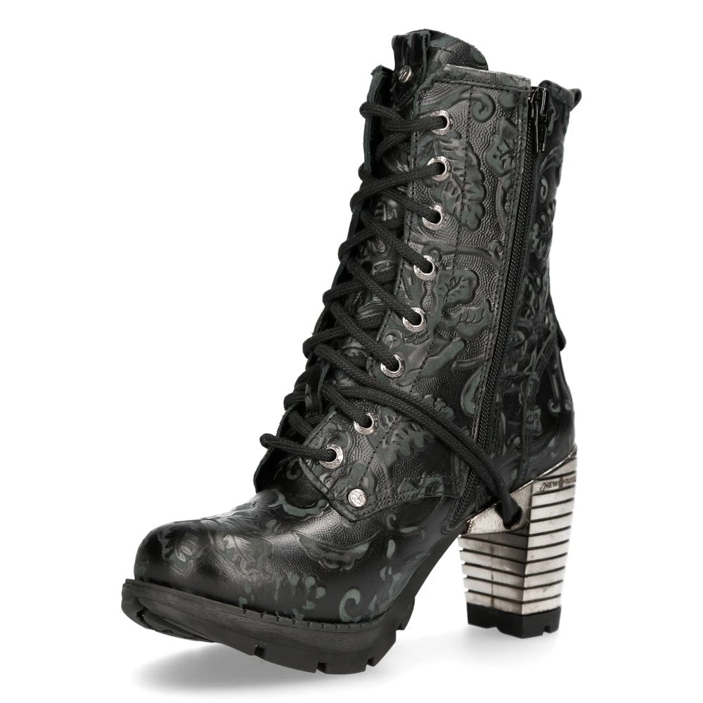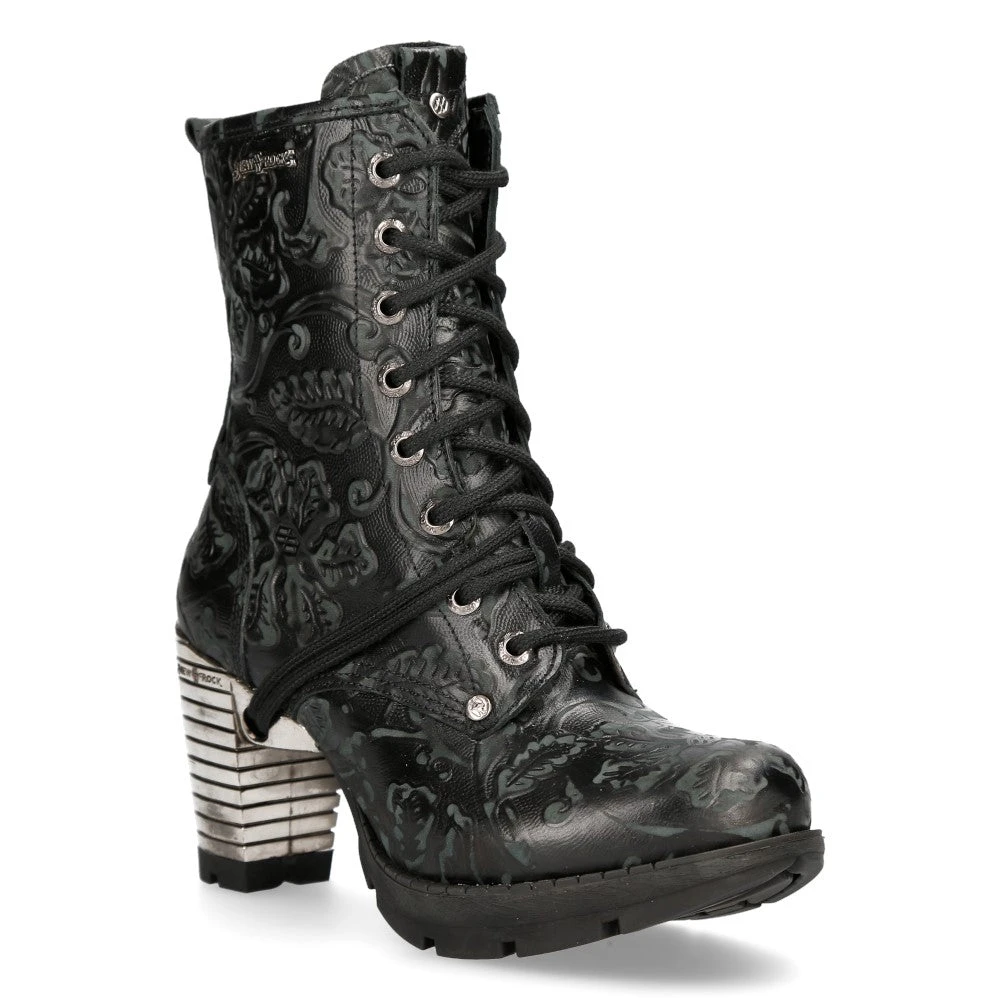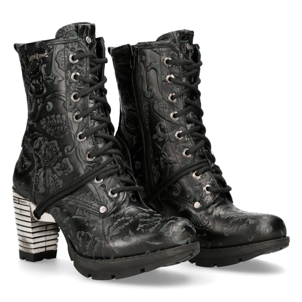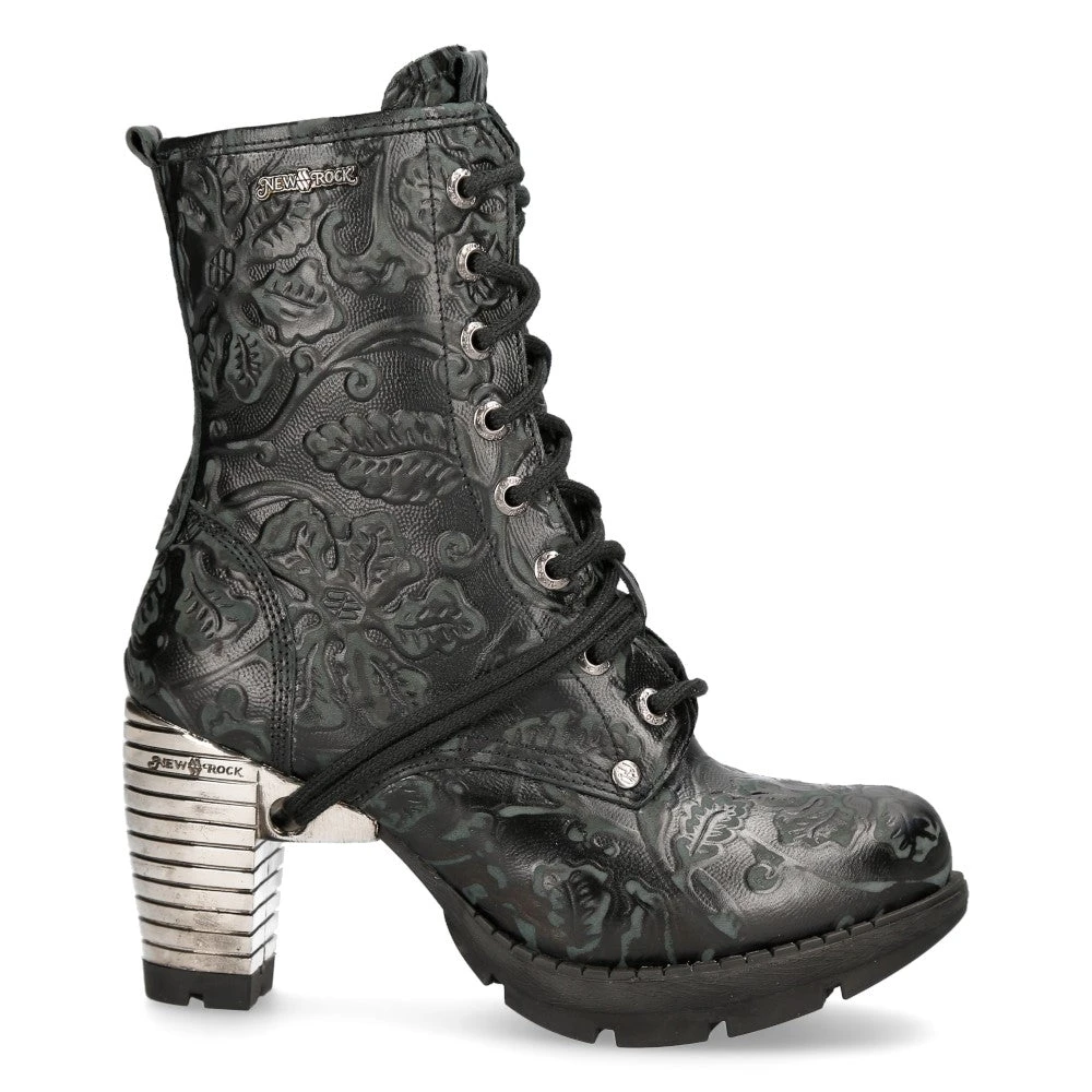 New Rock Vintage Flower Trail Boots M.TR001-S24. Embossed floral black leather. Decorated with a steel trail heel. Laces and side zip. Part of the Trail Collection.