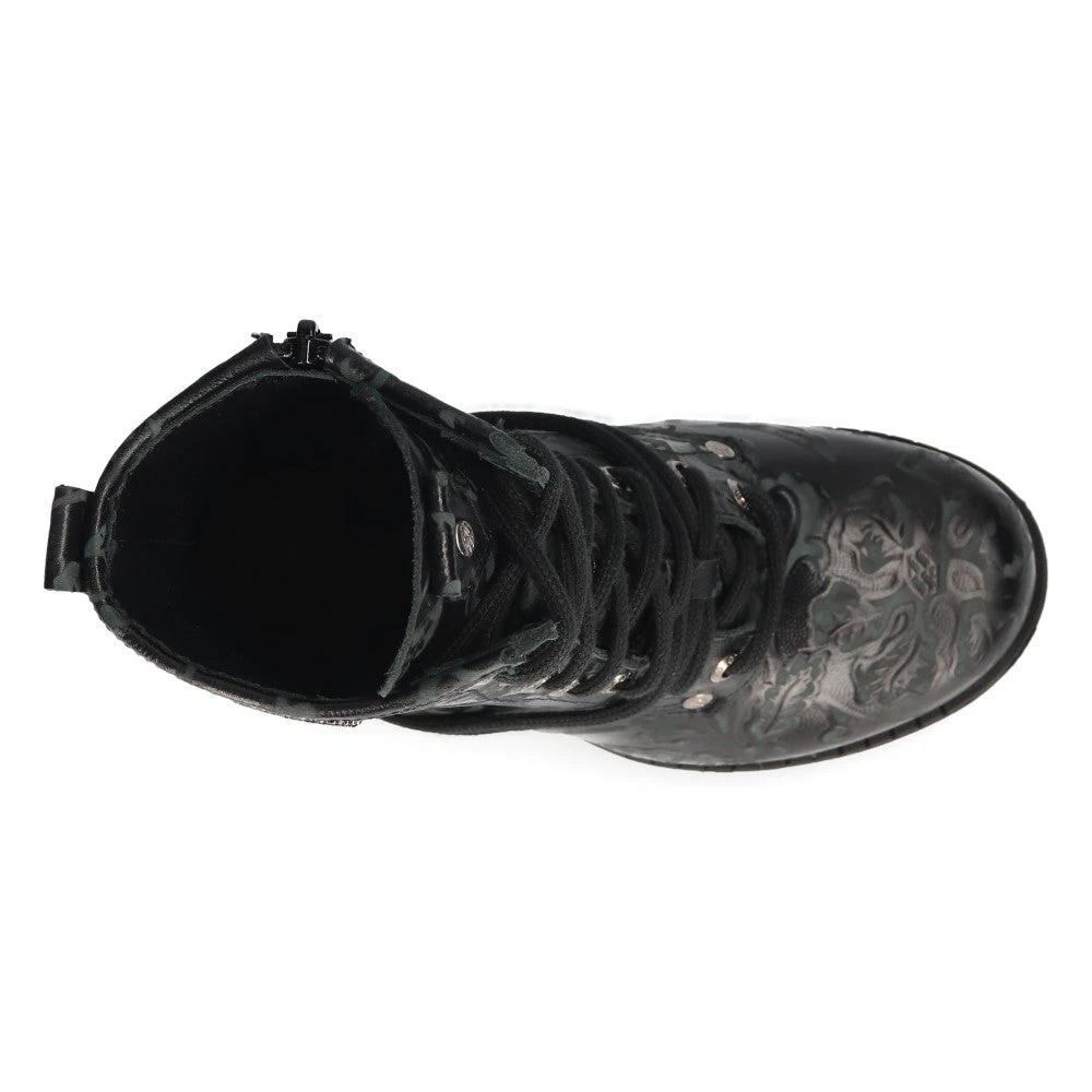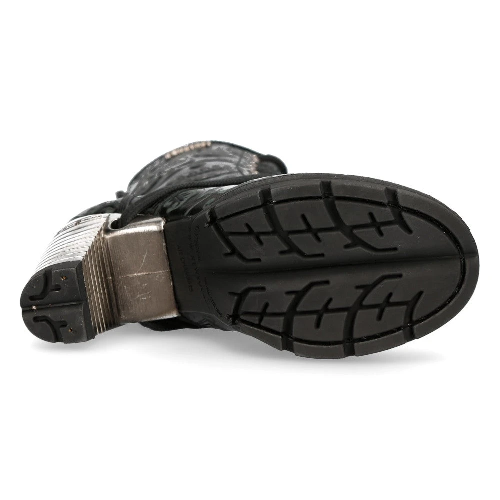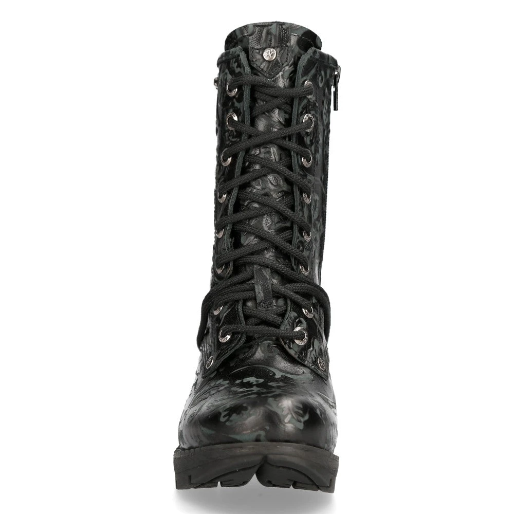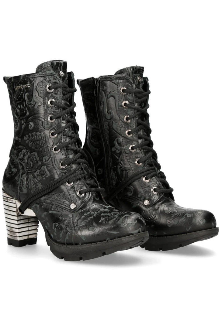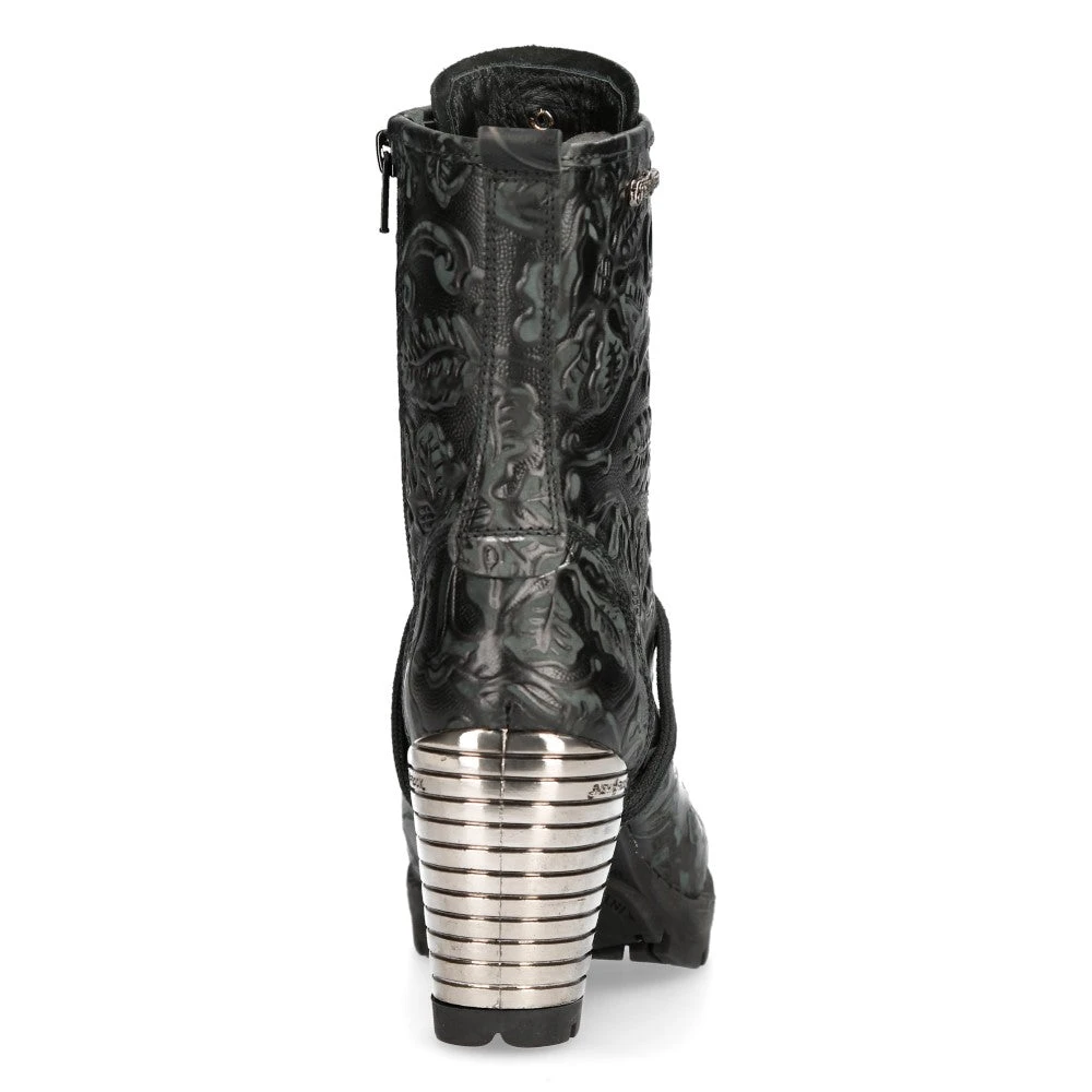 New Rock Vintage Flower Trail Boots M.TR001-S24. Embossed floral black leather. Decorated with a steel trail heel. Laces and side zip. Part of the Trail Collection.