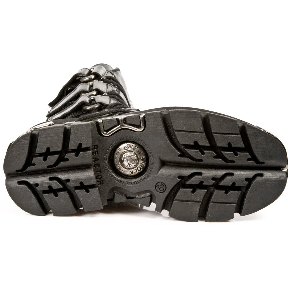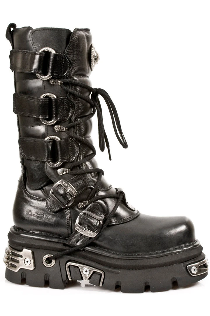 New Rock M474 black High calf boot with two buckles, six velcro fastenings, laces, Reactor Sole with front and back plates with new rock badge on upper.