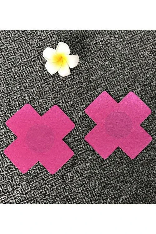 1 pair of pink cross shaped self adhesive single use disposable nipple covers in pink satin style finish.
