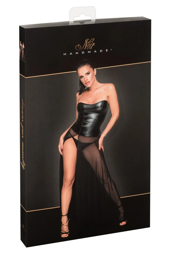 Extravagant style for provocative appearances! Ankle-length dress in a mix of matt, shiny powerwetlook (corsage) and transparent powernet (skirt). The tightly cut corsage is decorated with rhinestones at the front, which continue on the high side slit of the skirt. At the back the skirt is also slit breathtakingly high in the middle.