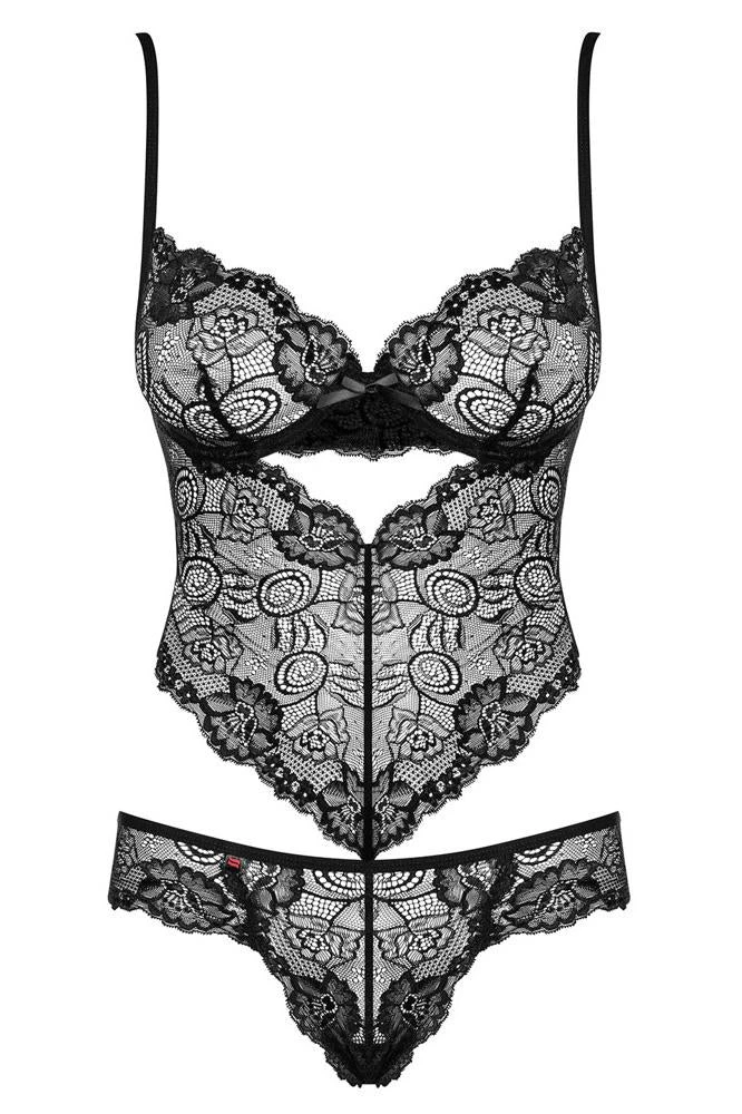 Stylish back in a two-piece design! Black G-string body completely made out of black lace with lacing at the back. The straps are adjustable. Black.