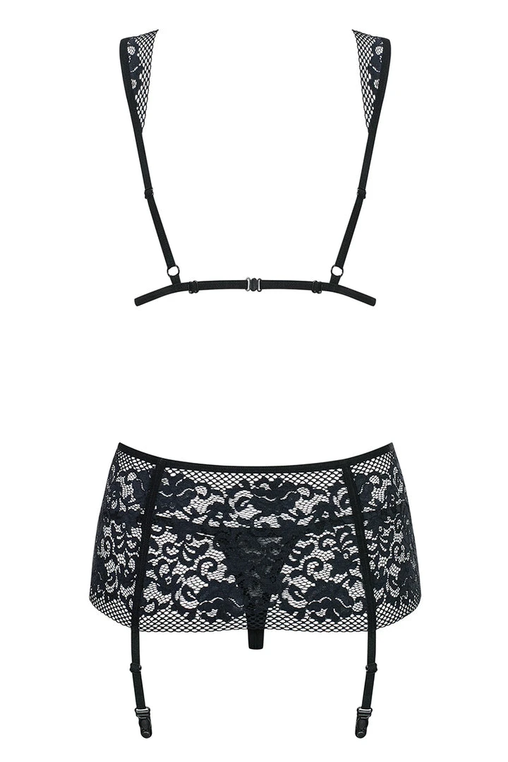 Amazing lace trio for sensual seduction! Wireless bra, suspender belt and string in a set. The bra and suspender belt are made entirely out of stretchy lace. The bra and suspender straps can be adjusted for a perfect fit. There is a small clip fastener at the back of the bra. The small classic string is included.