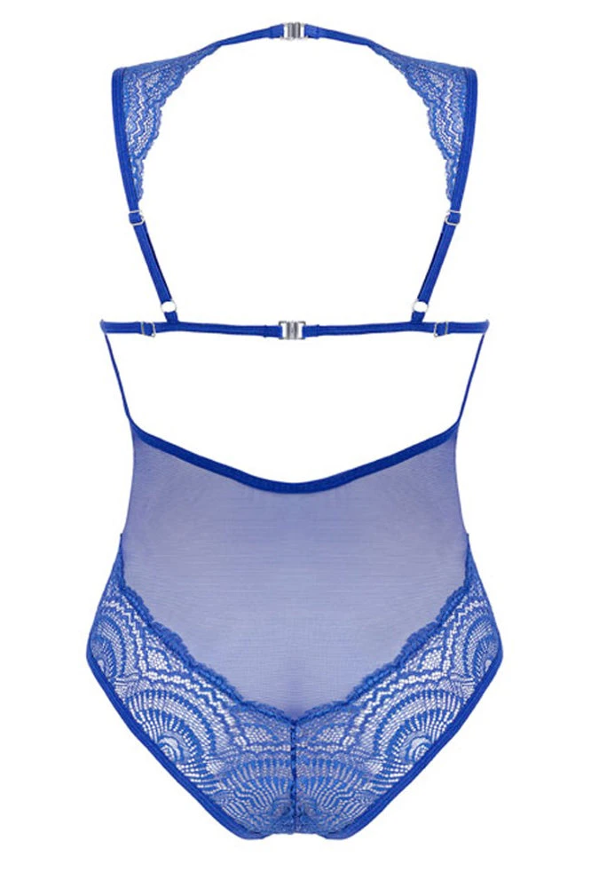 An elegant, royal blue body! The charming body Giselia from Obsessive is made out of delicate royal blue lace and delicate powernet. The body is soft & stretchy and this means that it is extremely comfortable to wear. The fancy design with a low-cut cleavage area and and an almost backless design at the back flatters the silhouette. The high-leg design also makes the legs look extremely long as well. The integrated underwired cups and adjustable straps mean that this body is a perfect fit. There is a clip fastener at the back and at the back of the neck. There is a hook fastener in the crotch area.