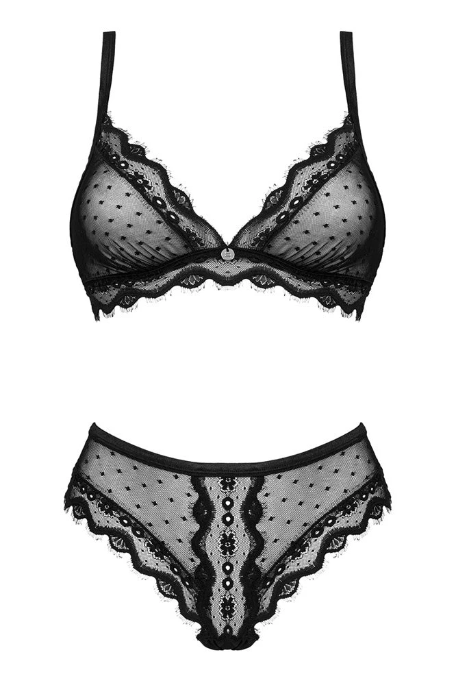 Stylish seduction! The bra and string set Marbell from Obsessive is made out of transparent black material that has dots and delicate eyelash lace on it. The set is velvety soft and stretchy for a comfortable fit. The bra has a decorative element between the soft cups and the straps can be adjusted. The matching string stands out because of its fancy design which emphasises the legs and buttocks in an arousing way.