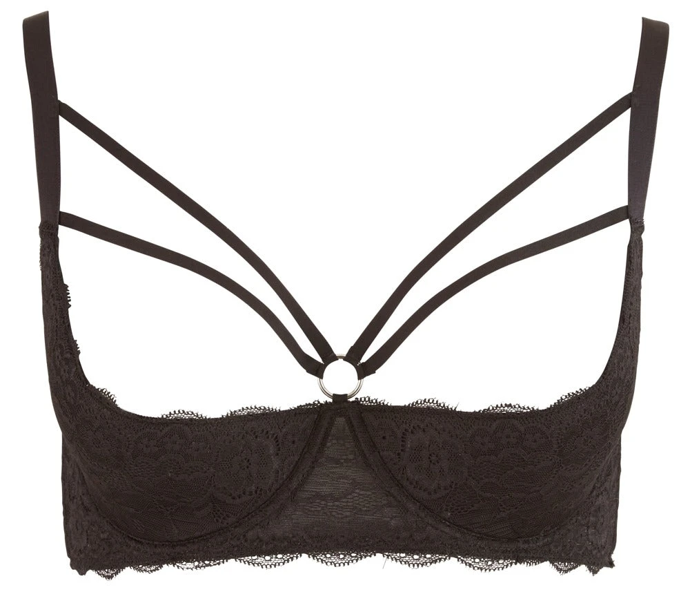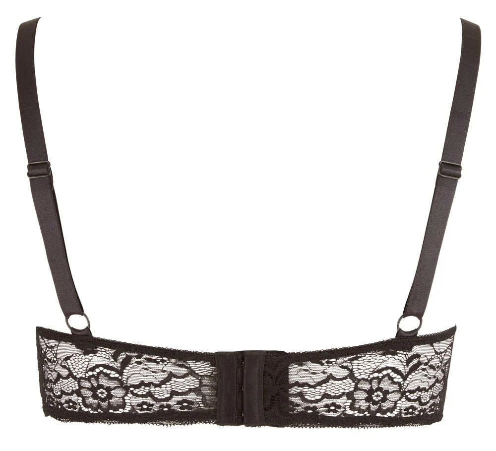 Put your breasts in the limelight! This seductive underwired shelf bra is made out of black lace and has a decorative ring between the slightly padded cups. There is a hook fastener at the back. Get this shelf bra now and show off your breasts in an extremely erotic way. With stretchy straps for a perfect fit.
