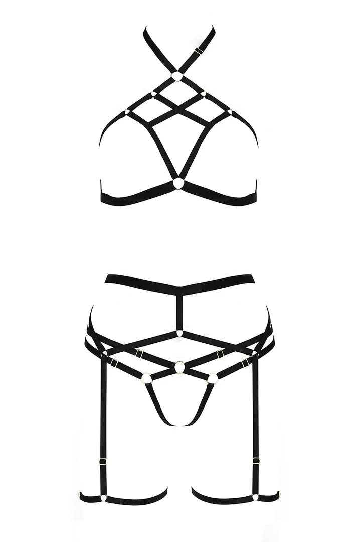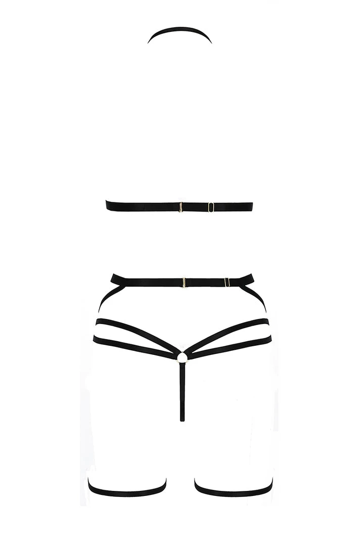 A miracle made of rubber straps, additionally adjustable, so that it fits to any silhouette. It definitely affects the senses, showing the woman’s body in all of its glory, only encircling it with black ribbons with golden ornaments.