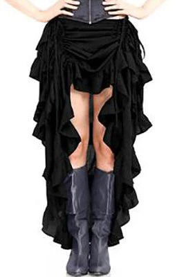 Steampunk Show Girl Skirt is made using soft & durable Rayon Fabric. The skirt has Four Tiers of Ruffles with adjustable length in front. The skirt can be worn down for Victorian styling, up on one side for Gypsy styling or front tied up for vintage burlesque looks. Waist has been elasticized for comfortable wearing.