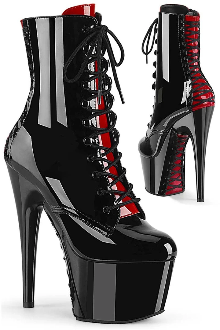 7″ (178mm) Heel, 2 3/4″ (70mm) Platform Two Tone Lace-up Front Ankle Boot with Interchangeable Color Tongues (Red and Black) and Corset Style Lacing on Platform Underside and at the Back, Inside Zip Closure.