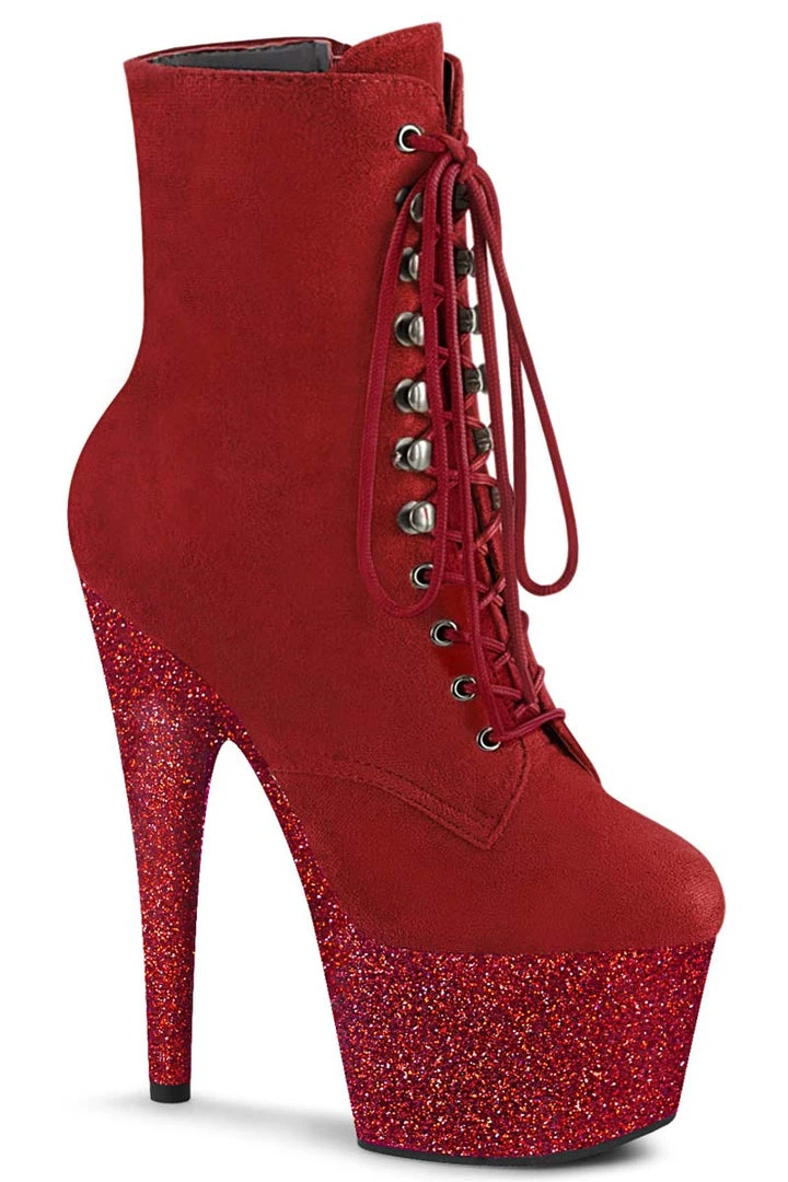 Pleaser ADORE Red Faux Suede 1020FSMG Boots with Red Multi Mini Glitter Heels.