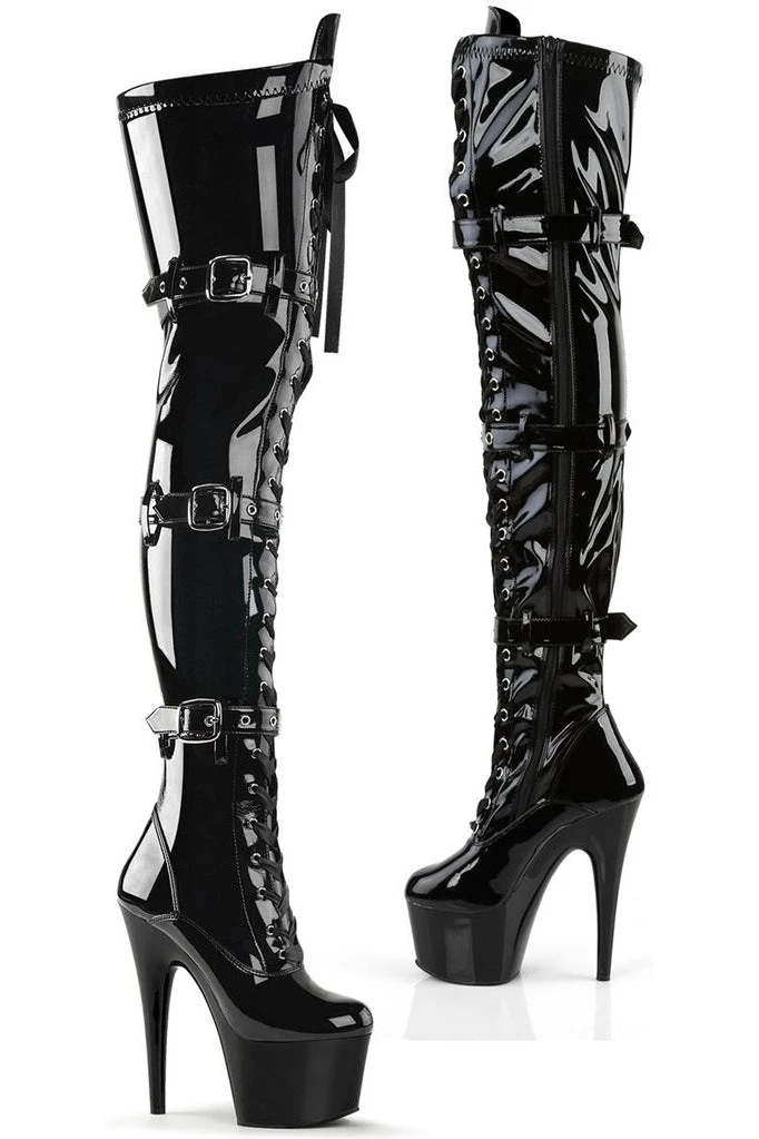 7″ (17.8cm) Stiletto Heel, 2 3/4″ (7cm) Platform Front Lace-Up Triple-Buckle Thigh High Boot, Full Side Zip Closure.