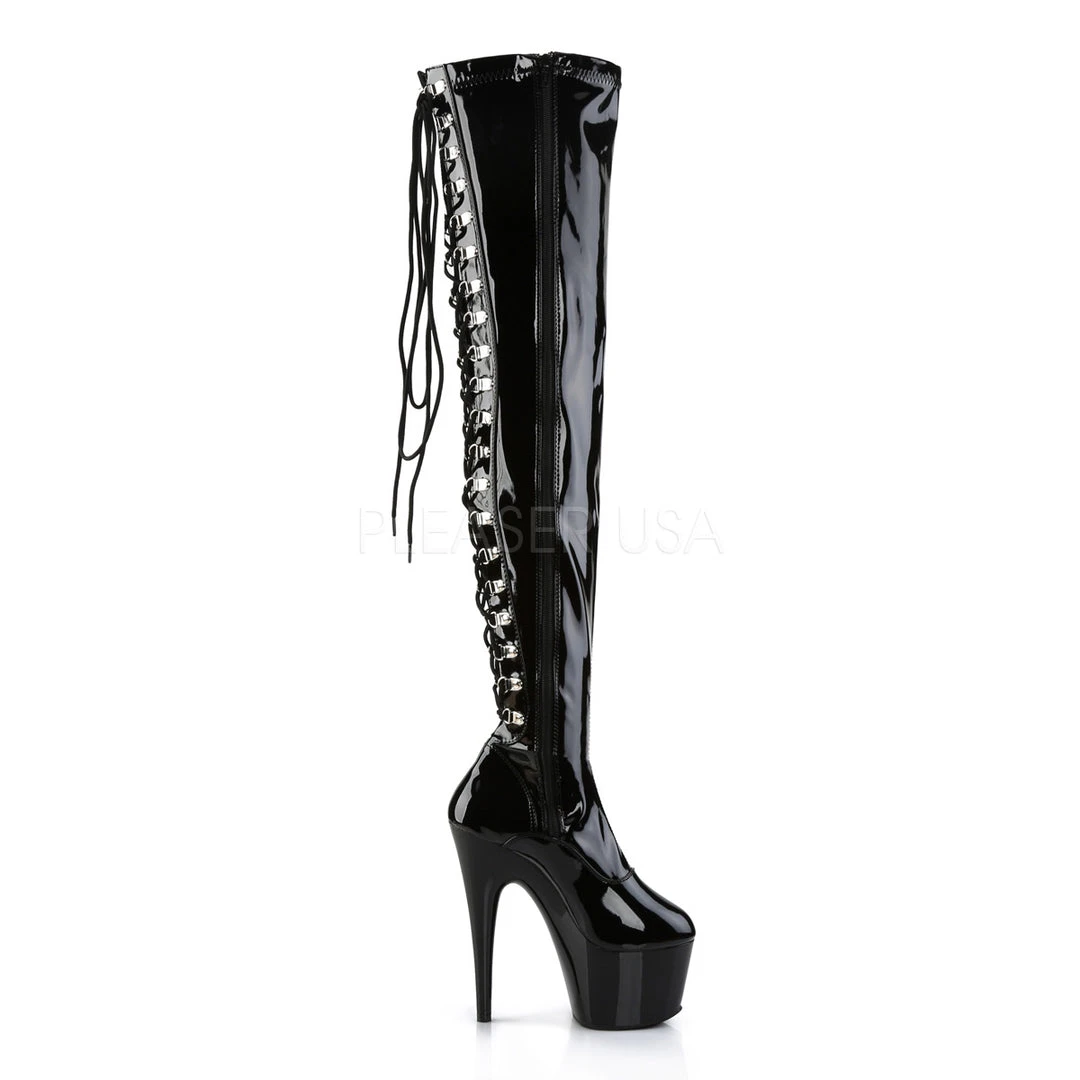7″ (17.8cm) Stiletto Heel, 2 3/4″ (7cm) Platform Rear Lace-Up Stretch Thigh Boot, Full Inner Side Zipper.
