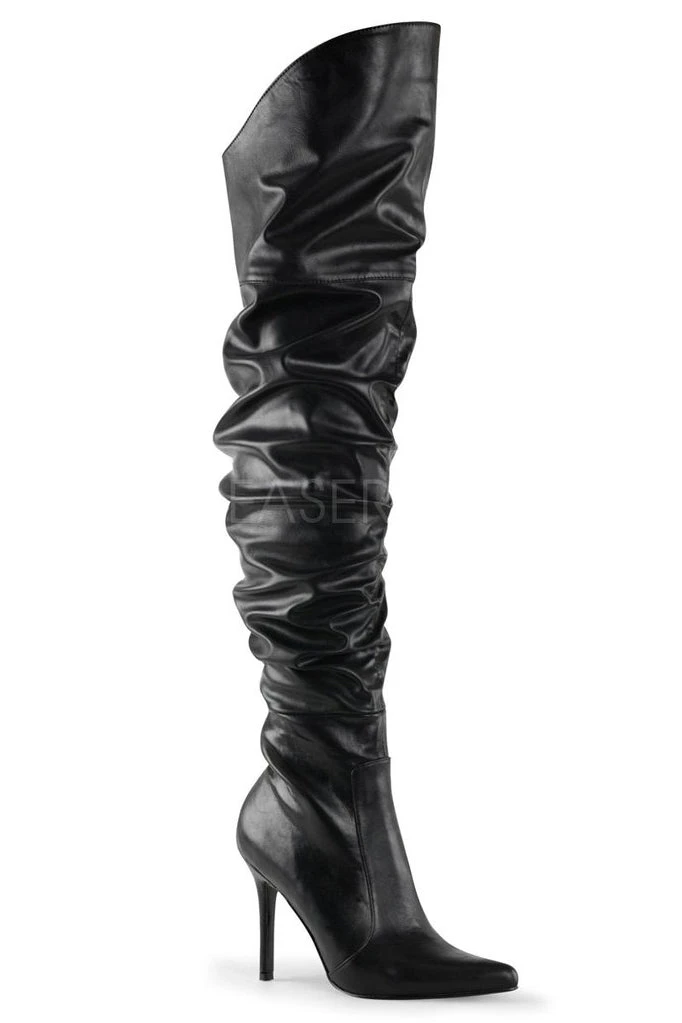 4″ (10.2cm) Sleek Stiletto Heel Thigh High Scrunch Boot Featuring Pointed Toe and Faux Fur Lining, 3/4 Inside Zip Closure.
