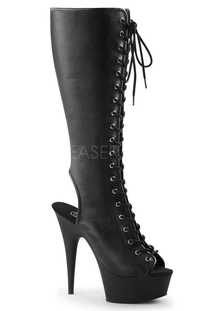 6″ (15.2cm) Stiletto Heel, 1 3/4″ (4.5cm) Platform Peep Toe, Open Heel Front Lace-Up Knee High Boot, Full-Length Inside Zip Closure.