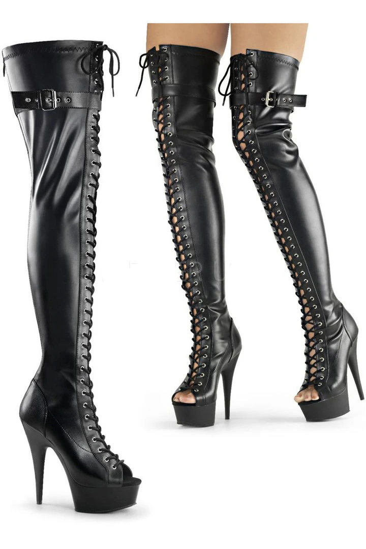 6″ (15.2cm) Stiletto Heel, 1 3/4″ (4.5cm) Platform Peep Toe Front Lace-Up Thigh High Boot with Buckled Strap, Full-Length Back Zip Closure.