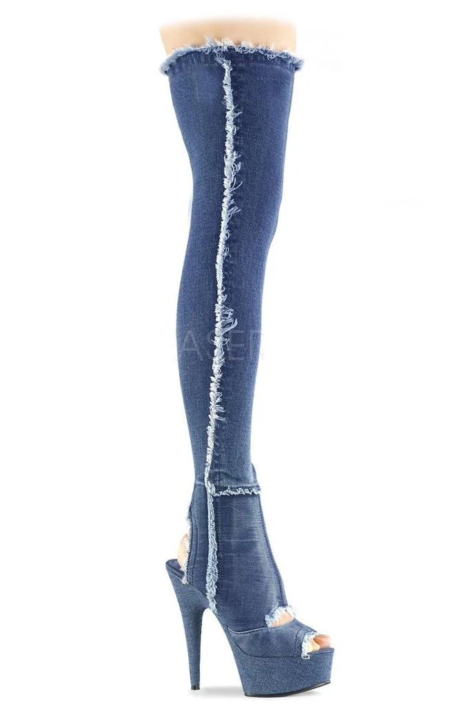 6″ (152mm) Heel, 1 3/4″ (45mm) Platform Open Heel/Toe Stretch Denim Cutout Thigh High Boot, 1/2 Inside Zip Closure.