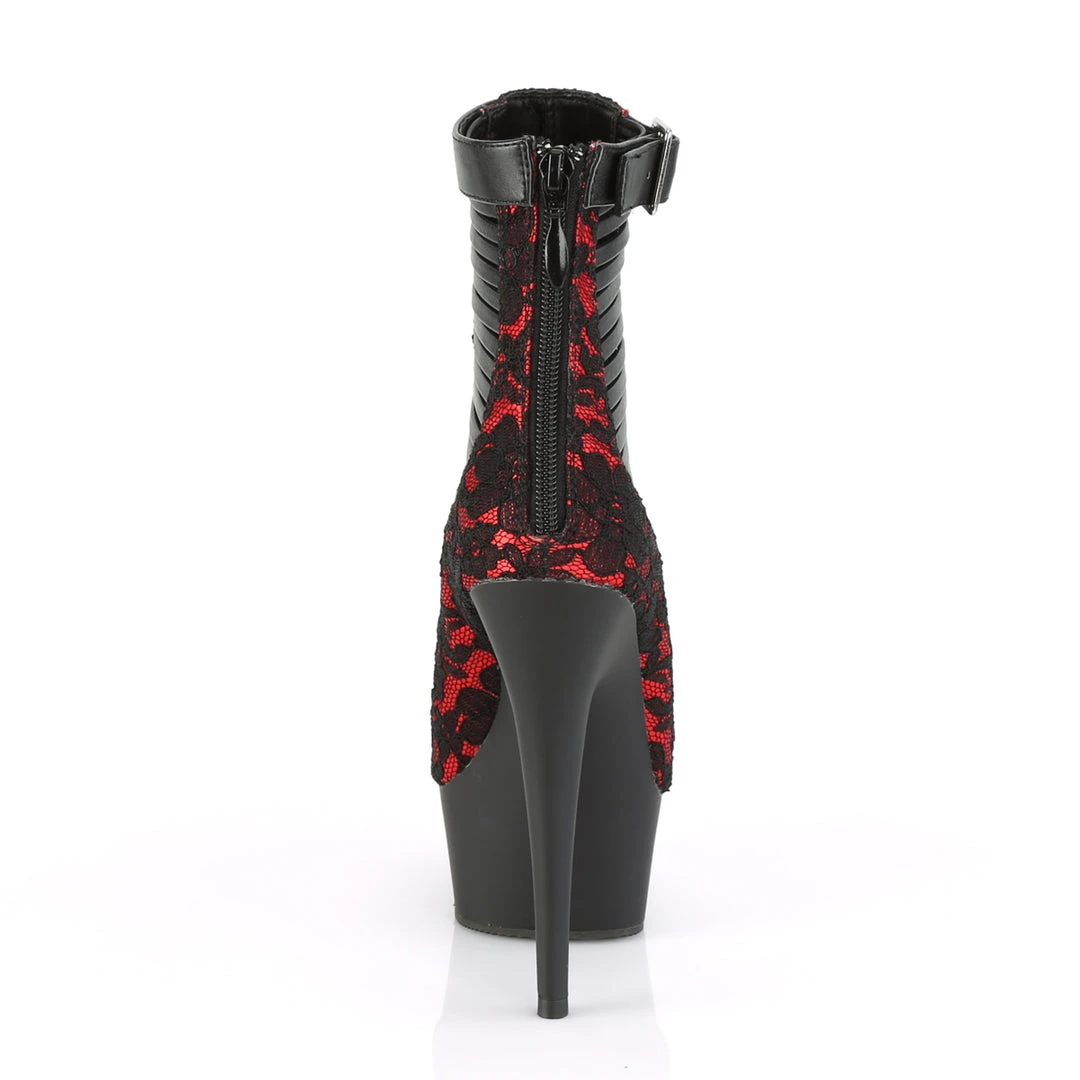 6″ (152mm) Heel, 1 3/4″ (45mm) Platform Open Toe Strappy Ankle Bootie with Buckled Ankle Strap and Lace Overlay Detail, Back Zip Closure.