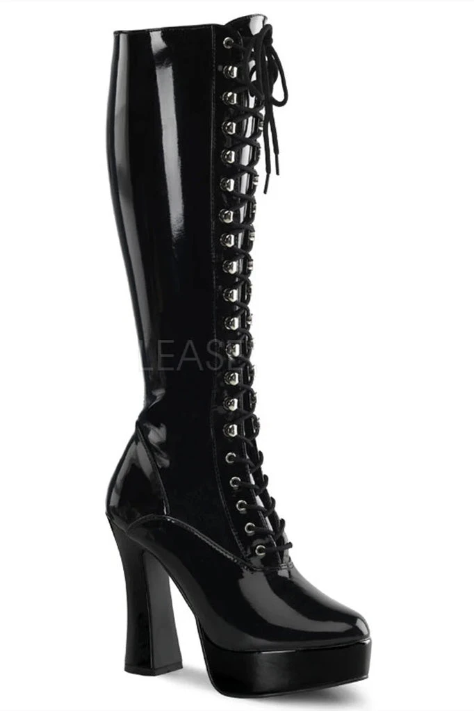 5″ (12.7cm) Stack Heel, 1 1/2″ (3.8cm) Platform Knee Boot with Lace Front Detail, Full Inner Side Zipper.