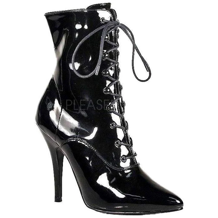 Pleaser Seduce 1020 Black Patent Calf Boots. Black Patent Effect Calf Boots with ski hook lacing and five inch stiletto heel. Side zip fastening.