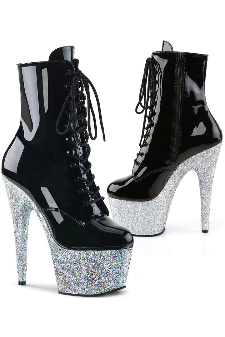 Pleaser Black Patent PVC with Silver Multi Glitter Heels ADORE-1020LG Boots.