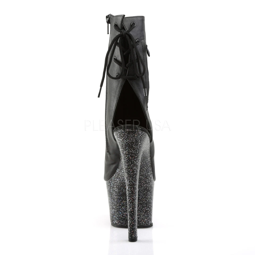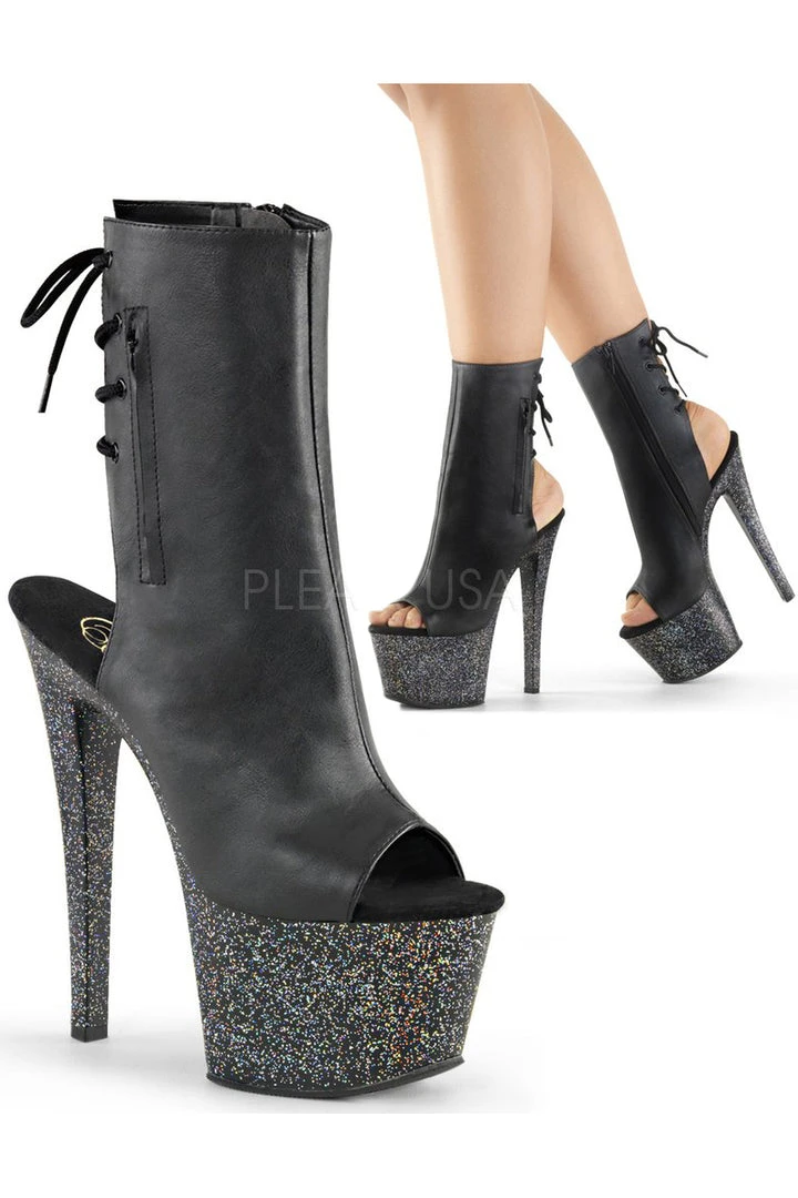 7″ (17.8cm) Heel, 2 3/4″ (7cm) Platform Open Toe/Heel Lace-Up Back Ankle Boot with Hidden Zip Pocket Featuring Mini Iridescent Glitter on Entire Bottom, Inside Zip Closure.
