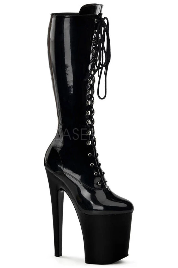 8″ (20.3cm) Spike Heel, 4″ (10.2cm) Platform Calf Boot, Full Inner Side Zipper.