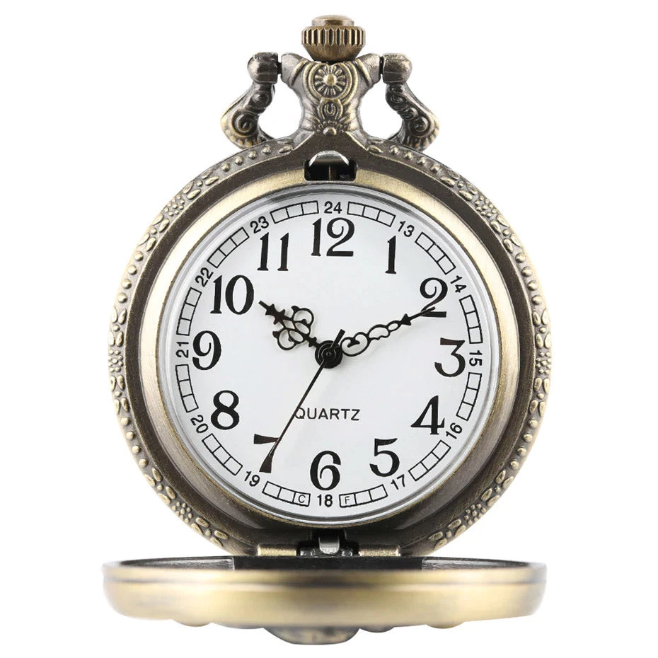 Antique Bronze Effect Steampunk Pocketwatch with Dinosaur design on the front casing and floral pattern on the back.
