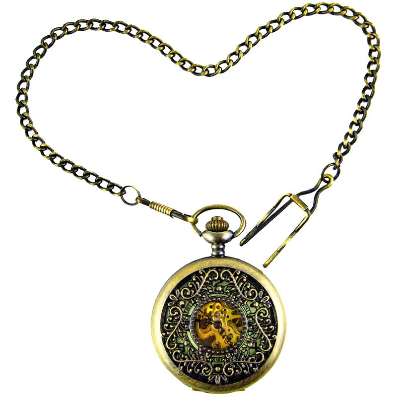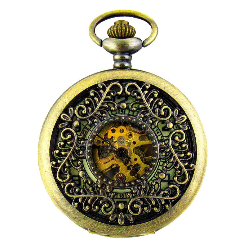 Clockwork Bronze Effect Steampunk Pocket Watch in Triangle Filigree Classic Victorian design with Mechanical Movement and Luminous Watch Face.