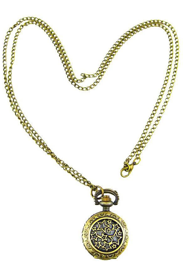 Miniature Stars Design Necklace Steampunk Watch on Chain. Decorated front features star design. Opens to display white face with black arabic numerals. Decorative back, metal chain and fastening for wearing around neck. Quartz battery powered movement.