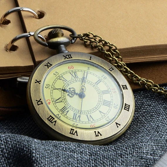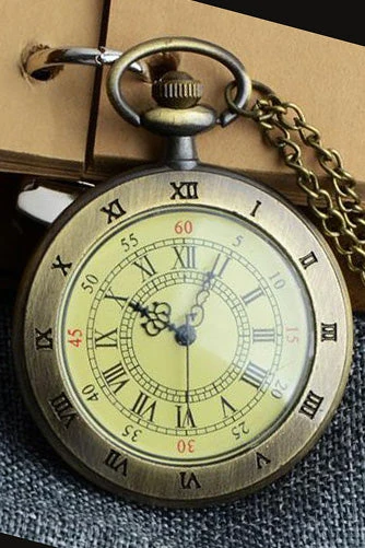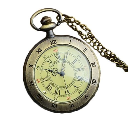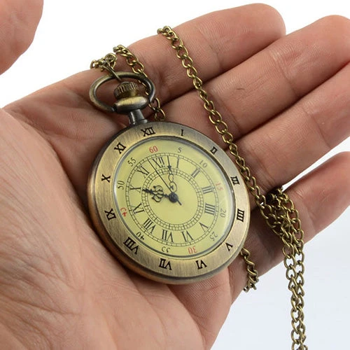 The watch is fixed with the face on display. Quartz movement with a bronze tone necklace chain for wearing. The watch case measures 4.5cm in diameter.
