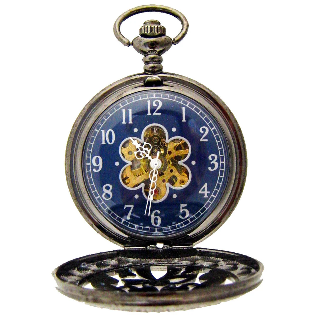 Decorated reverse housing with window showing movement. Blue Face with Silver Roman numerals and flower shaped window showing movement.Mechanical Movement with second hand. Metal chain and clip.
