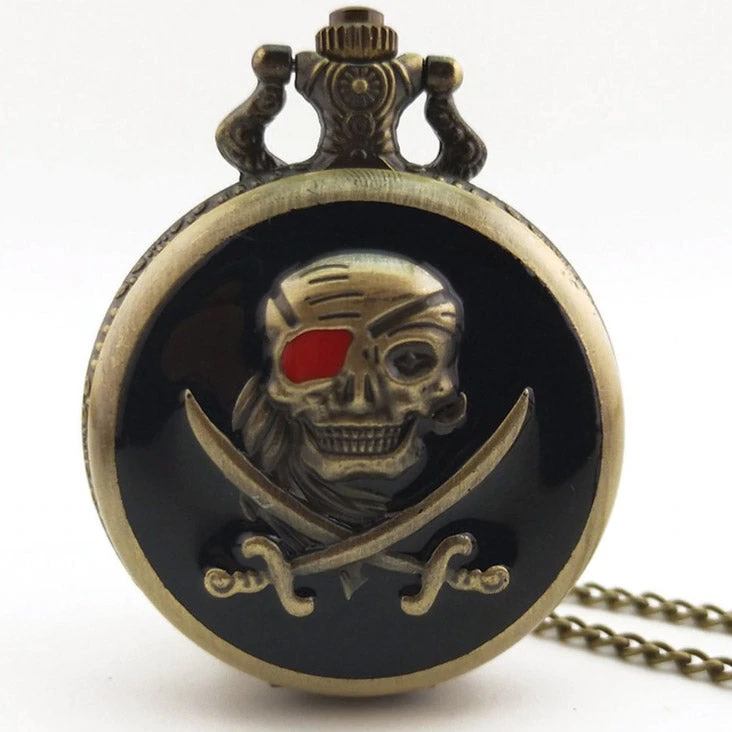 Antique Bronze Effect Steampunk Pocketwatch on necklace chain with raised skull and crossbones design on the front casing featuring infill with red eyepatch detail. The back casing has a floral pattern.