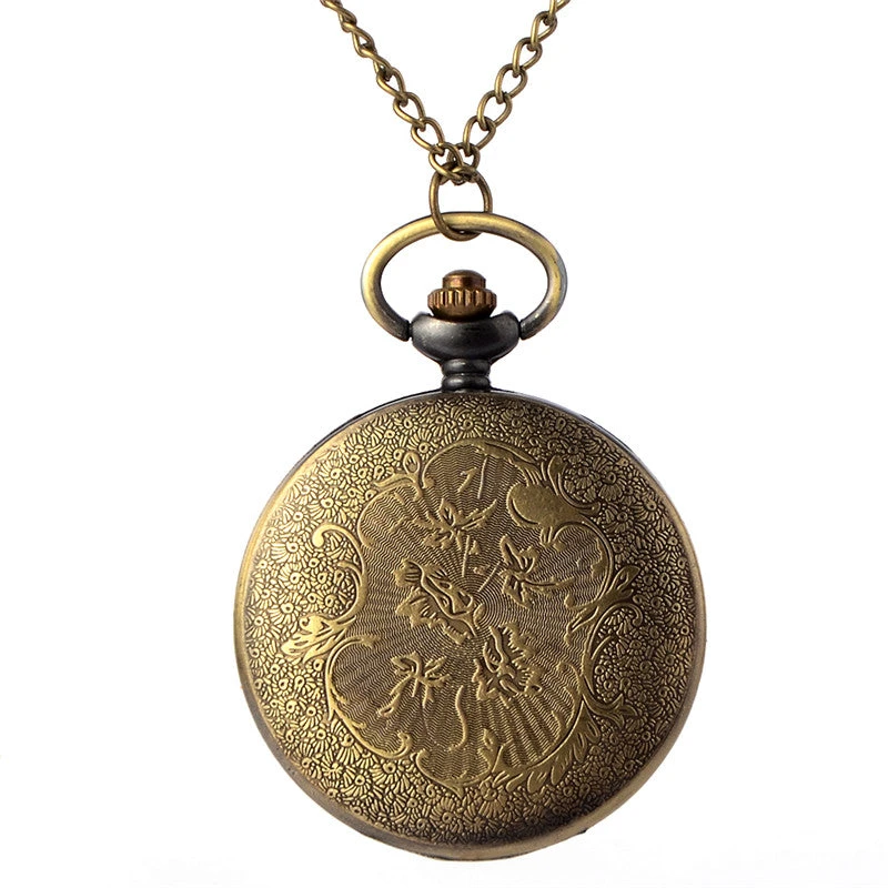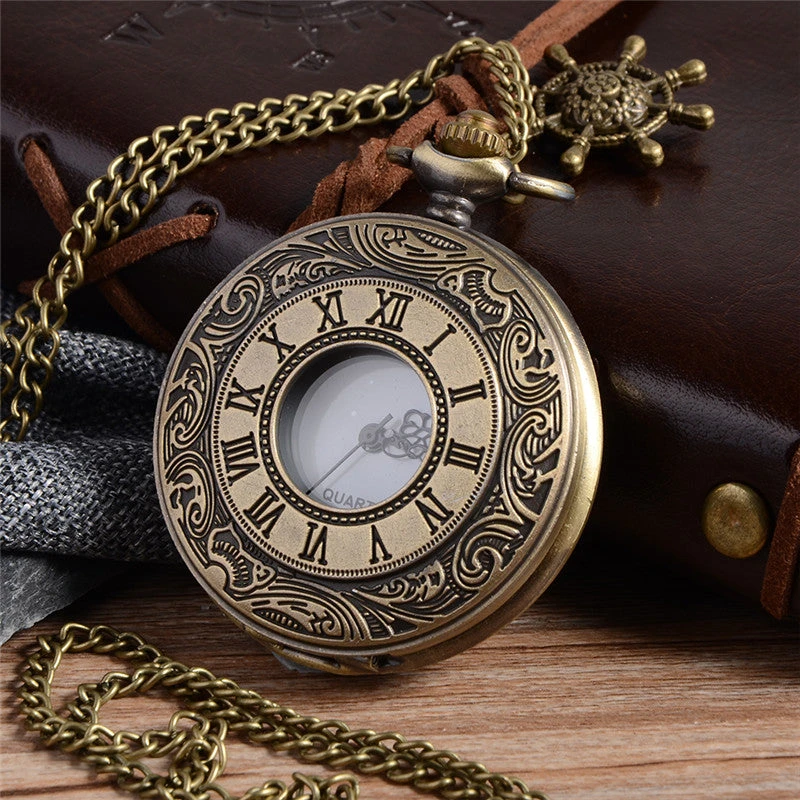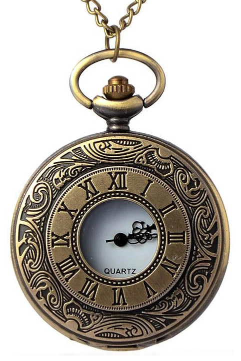 Antique Bronze Effect Steampunk Pocketwatch on necklace chain with open face design on the front casing with central cut out and roman numeral surround. The back casing has a floral pattern.