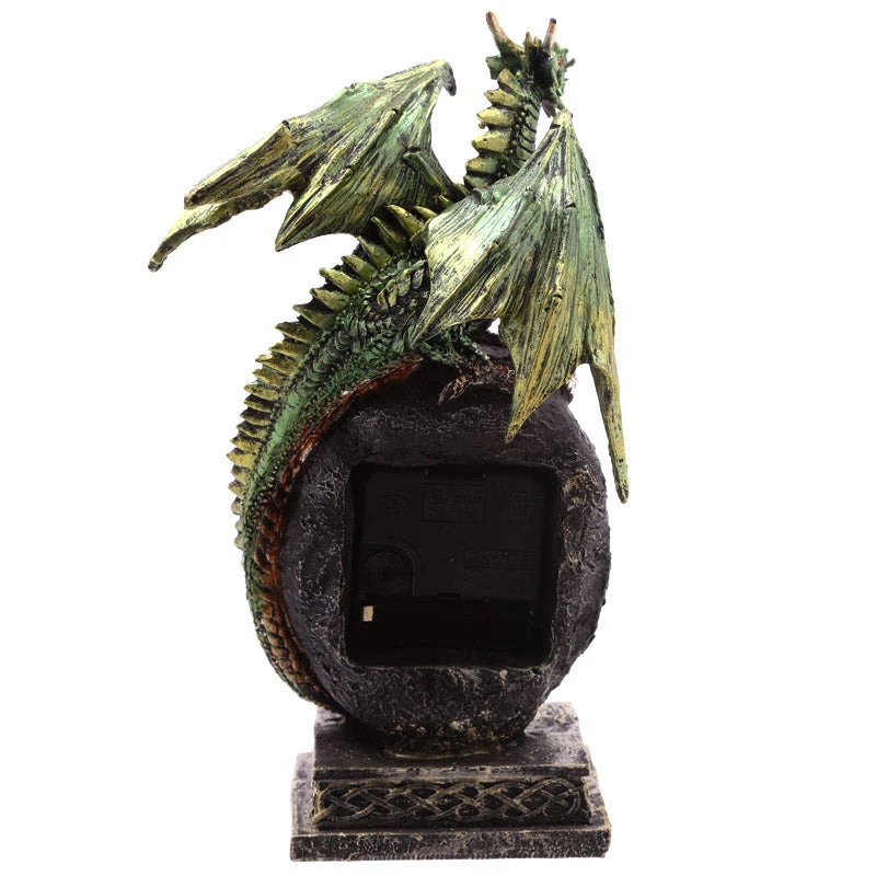 25cm tall Green Dragon sitting atop a geode style clock on stone plinth. Made from Resin. Hand painted. Made from Resin. Hand painted.