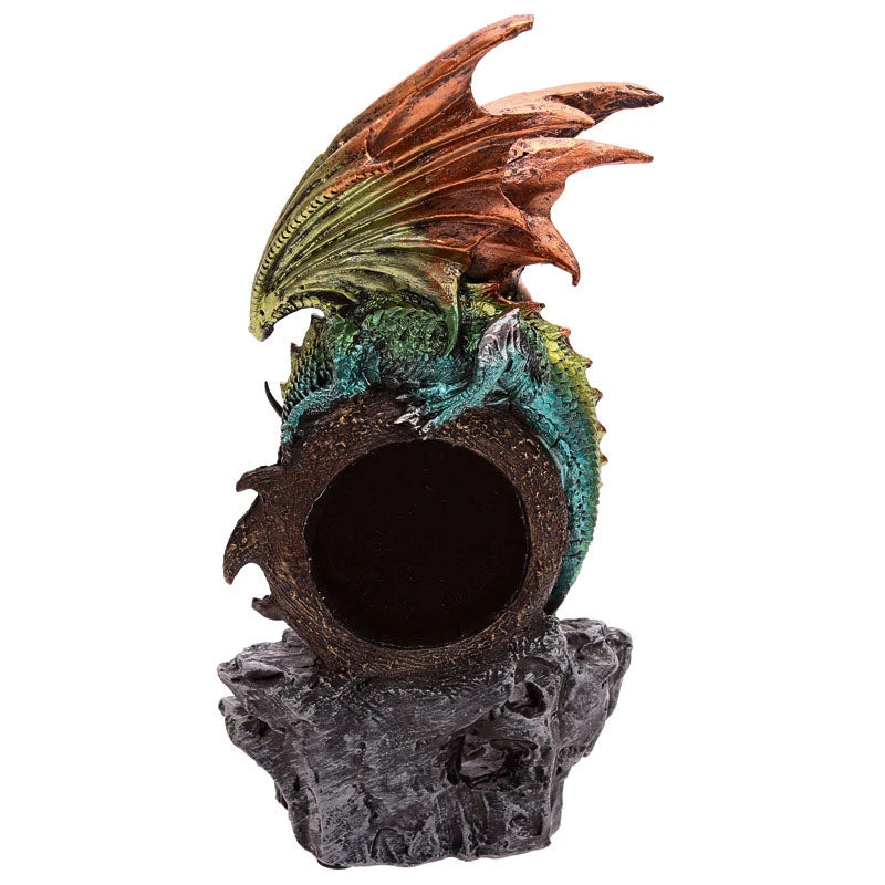 A Large Green Dragon sitting atop a Dragon Eye. Very Striking. Made from high-quality resin and hand-painted.