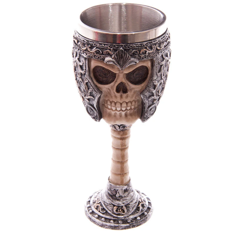 Striking Skull Goblet with skull shaped body wearing an metal effect armoured helmet, bone shaped stem, decorative metal collar between stem and body and decorative metal effect base. Stainless steel lining.