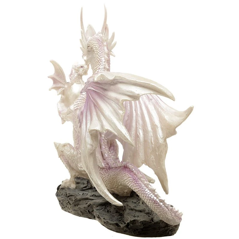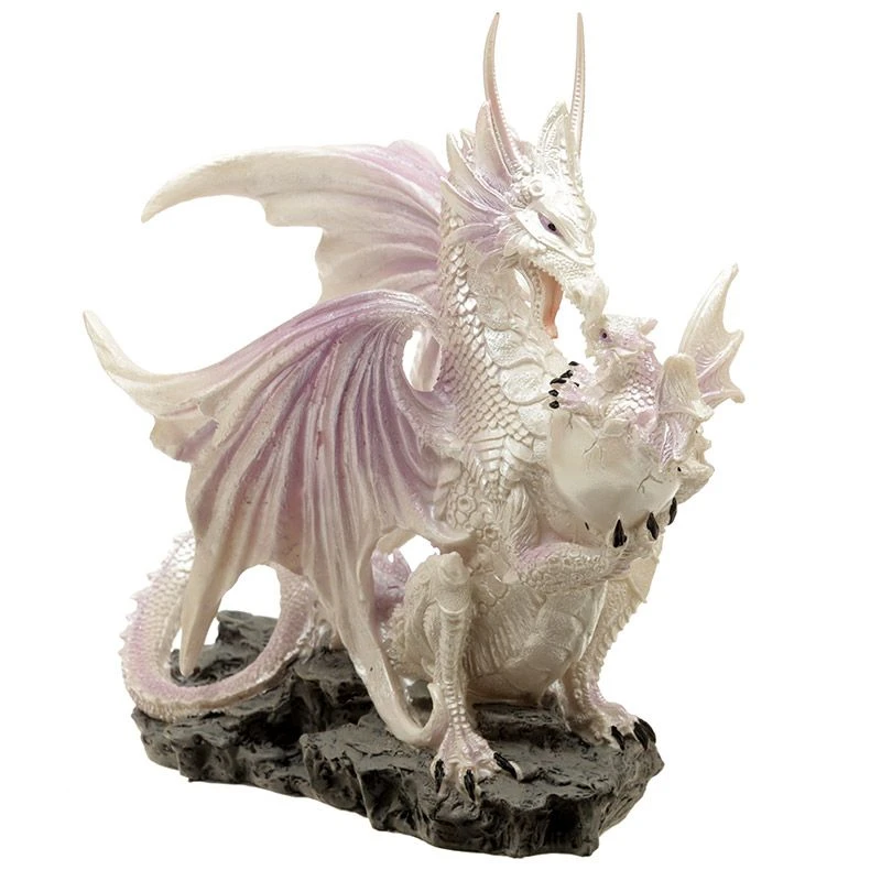 A very impressive large White Dragon Morther. Holding a Baby Dragon and Egg. Part of the Winter Warrior Dragon Collection. Made from high-quality resin and hand-painted.
