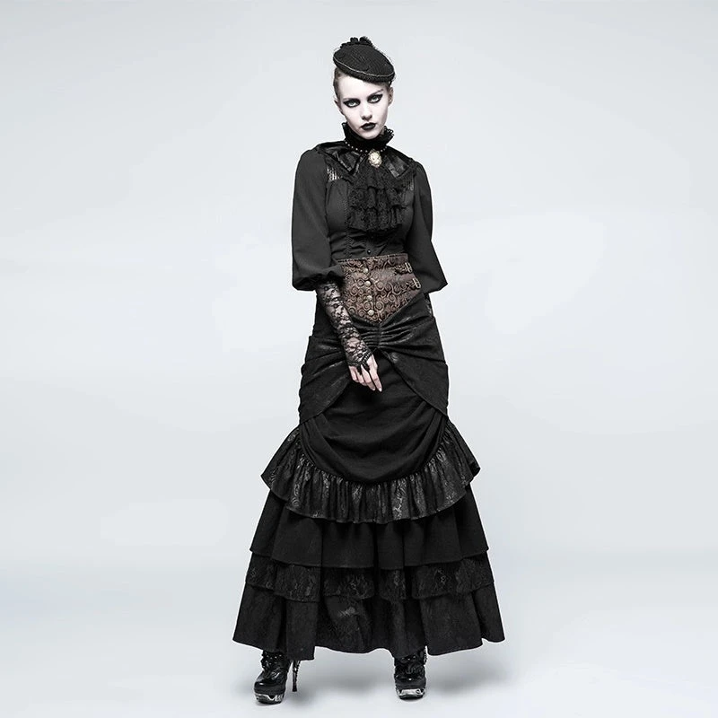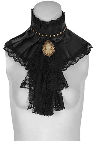 This stunning gothic collar features pleated black faux leather effect fabric edged in delicate black lace. The collar fastens at the back of the neck with two tiny buttons, while at the front there is a cascade of black lace in jabot style with a central cameo brooch.