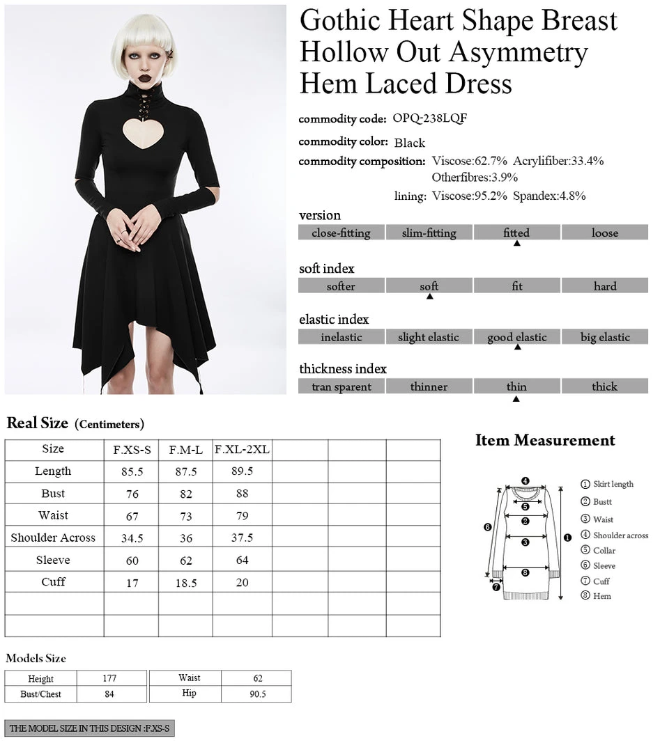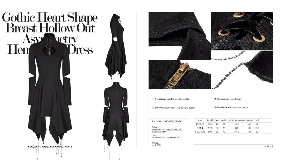 Long sleeved high laced neck dress with hollow out heart on the chest. Tight top and sun shape skirt. Asymmetric pointed hem.