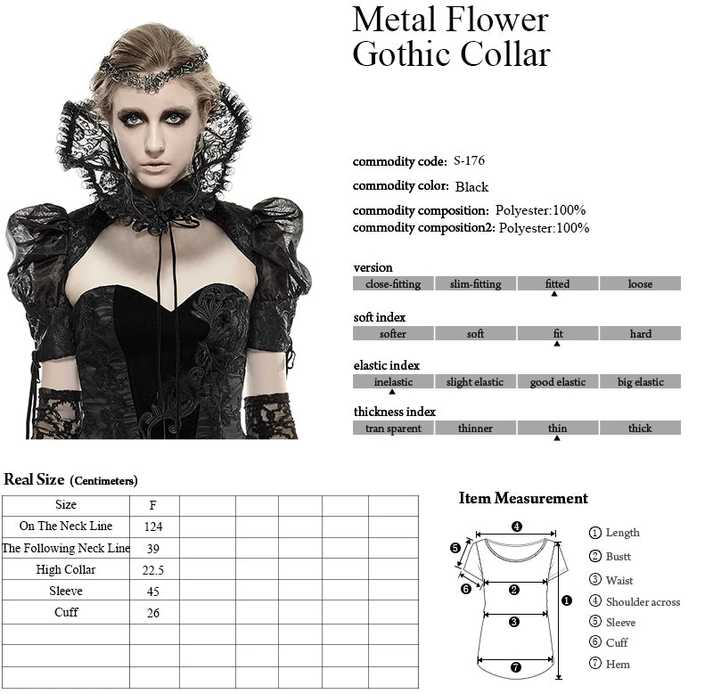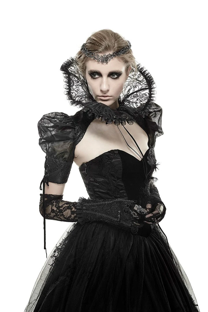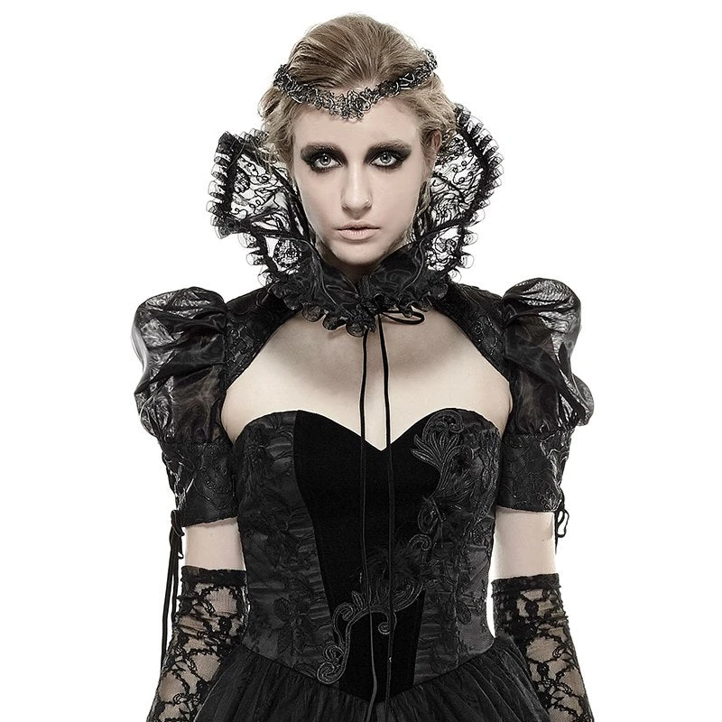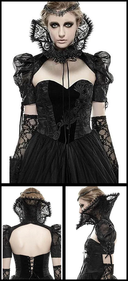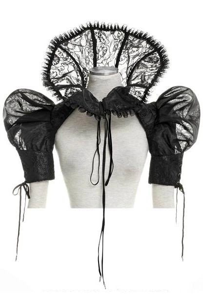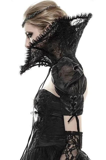 Ladies Evil Queen or Sorceress style classic high collar with attached sleeves in lace with mesh rouching, plastic boned collar, decorative drop lacing on sleeves and front ribbon fastening. One size fits most.
