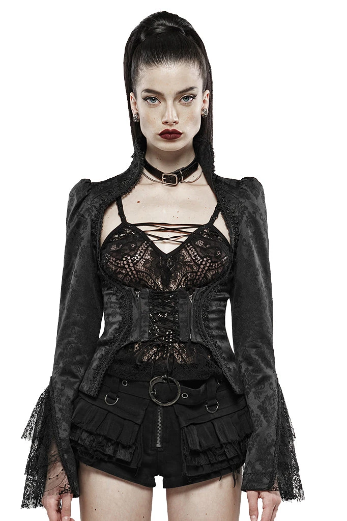 PUNK RAVE WY-1145 goth jacquard jacket women gorgeous stand collar puff long sleeve black lack drawstring waist coat.