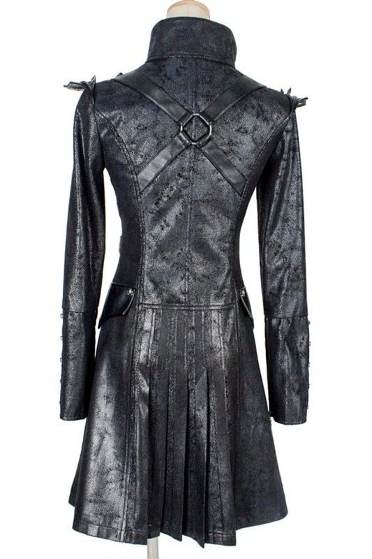 Black Military Style Coat with Steel Spike Detailing on the Shoulders. Zip Front with Flaming Skull Zip Pull and Decorative Buttons. Faux Pocket Detailing with Slight Pleating at the Back for Ease of Movement.