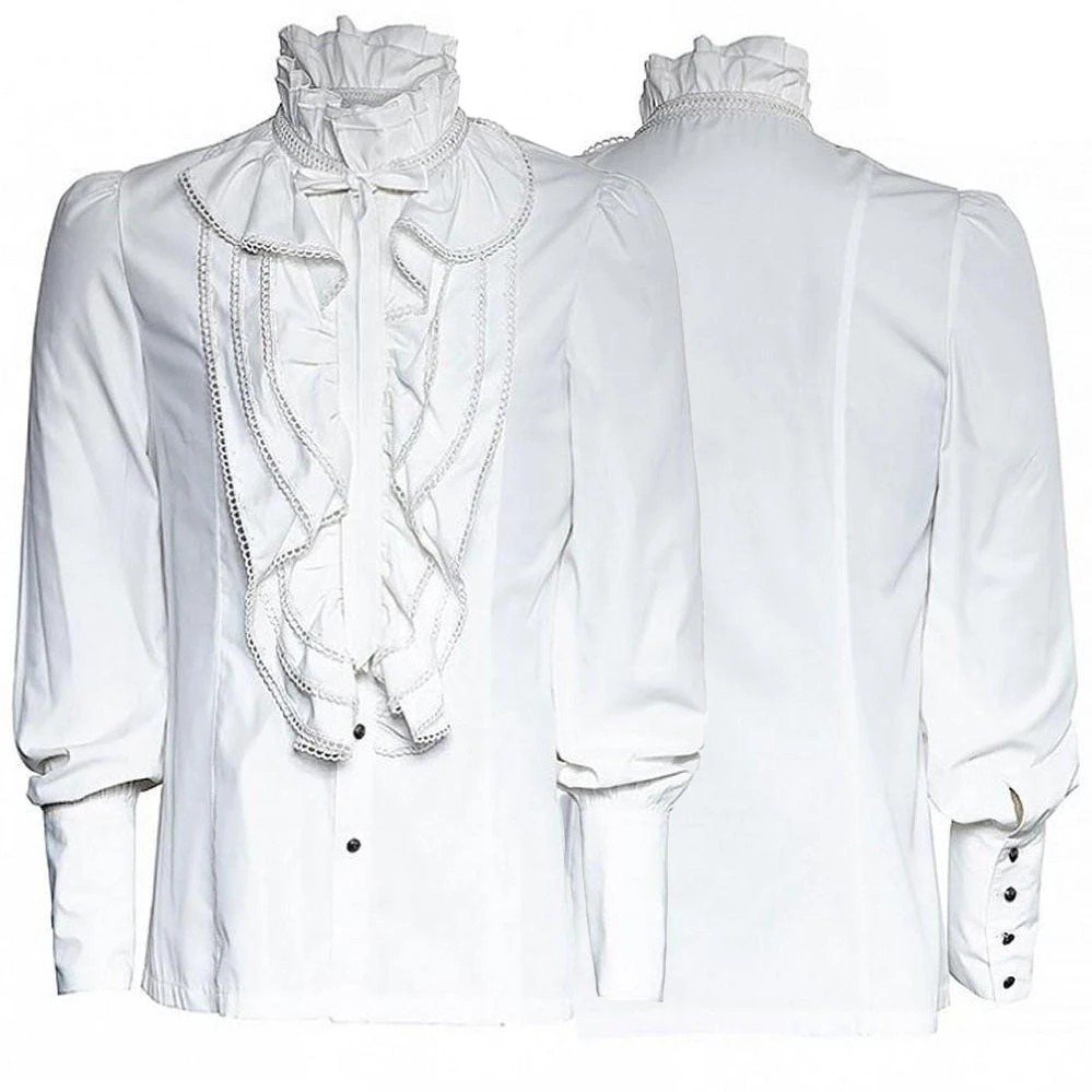 This fabulous white mens gothic frill shirt is great for both gothic and Steampunk outfits, with ruffles down the front with scalloped embroidery detail on the edges and patterned antique silvertone buttons down the centre fastening and on the sleeve cuffs.