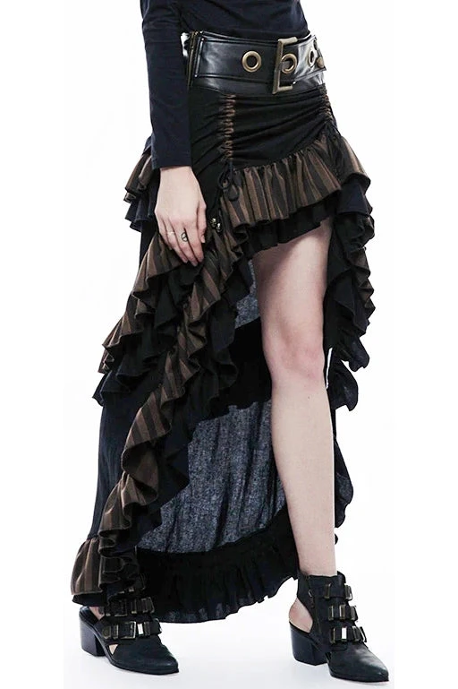 - Ruffled layered striped black-brown adjustable bustle skirt short at the front and extra long at the back
