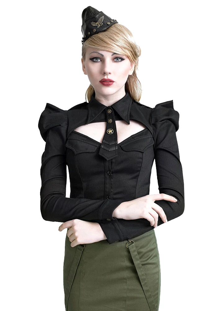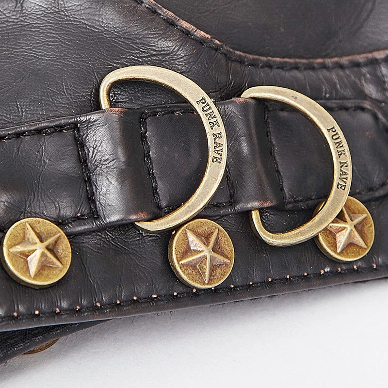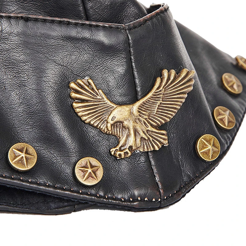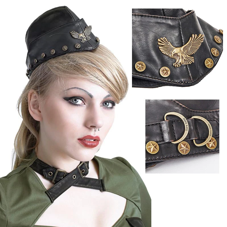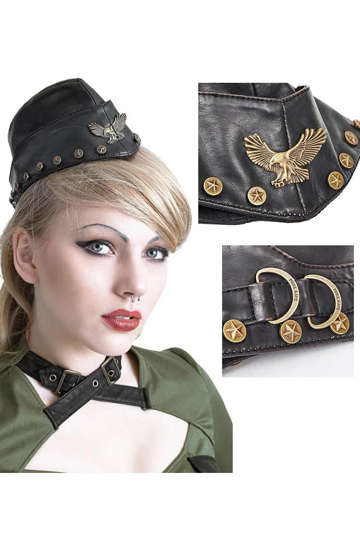 Aged Faux Leather Soldier Side Cap from Punk Rave. Studded Bronze Stars Run Along the Leather Panel. Attaches with two Crocodile Style Hair Clips for a secure fit.