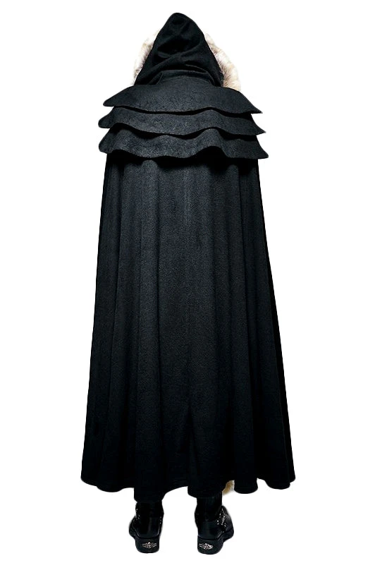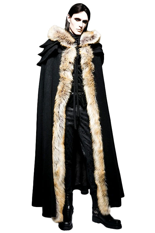 Punk Rave Winterfell Cloak in Black with Natural Coloured Faux Fur Trim and Hood.