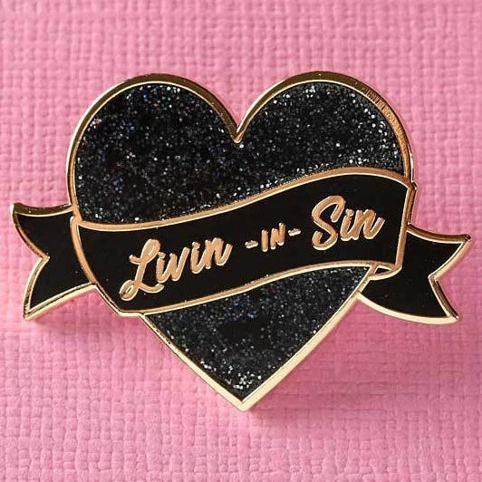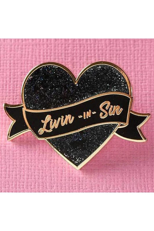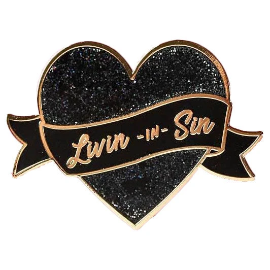 This Livin in Sin Pin is super sparkly with a glitter heart and black text scroll The hard enamel pin measures approx 32 mm across, with rubber lapel pin clutch clasp.