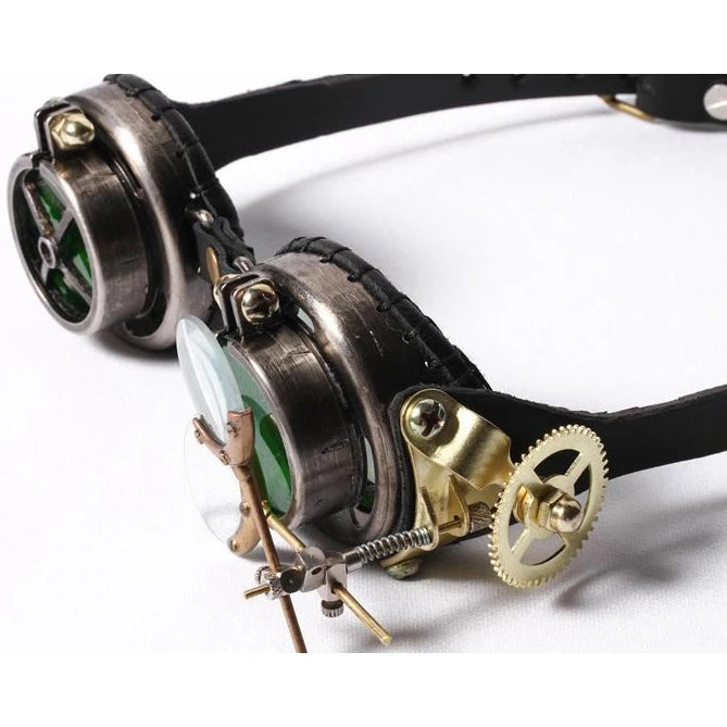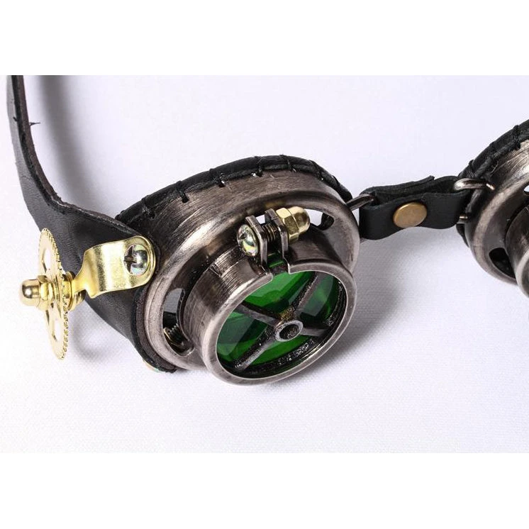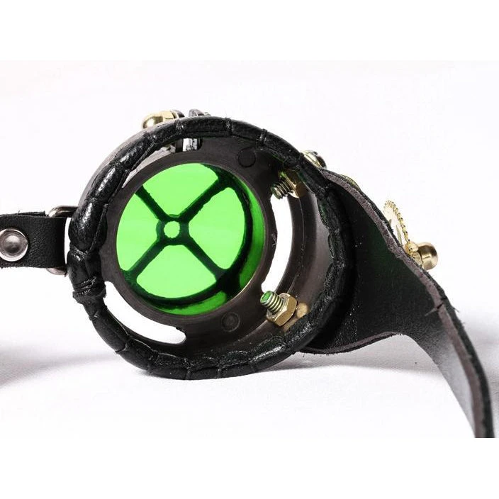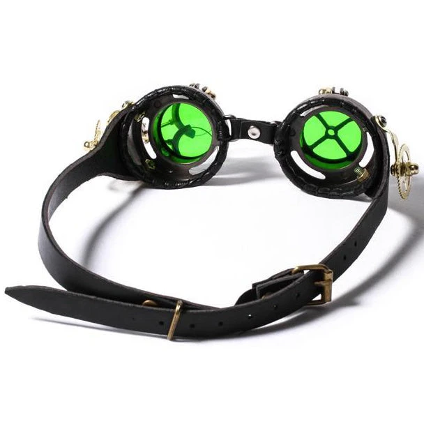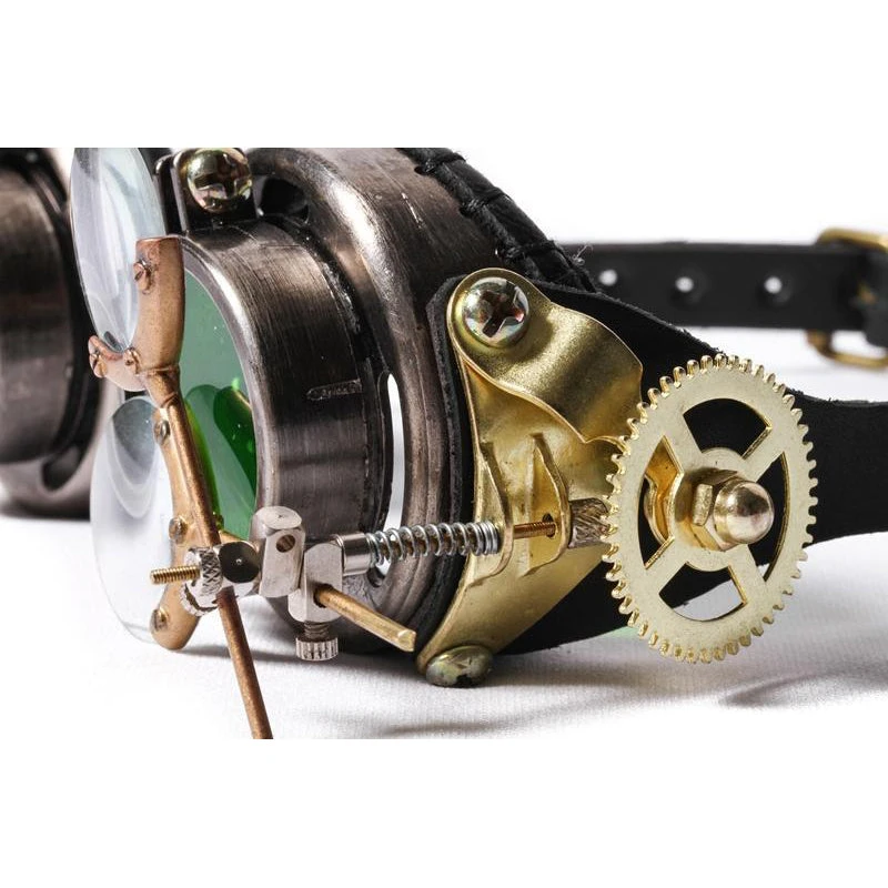 Steampunk Headwear eyewear accessory: goggles with 3 interchangeable lenses in black, red and green.